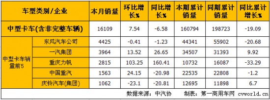 8月份中型卡車(含非完整車輛)產(chǎn)量前5的企業(yè)依次為:東風(fēng)汽車公司(4892輛)、一汽集團(tuán)(4166輛)、重慶力帆(2427輛)、中國(guó)重汽(1886輛)和慶鈴汽車(1148輛),5家合計(jì)生產(chǎn)14519輛,占中型卡車(含非完整車輛)總產(chǎn)量16359輛的88.75%。由上表可見(jiàn),8月產(chǎn)量第2、3、4位的一汽集團(tuán)、重慶力帆和中國(guó)重汽三家企業(yè)實(shí)現(xiàn)環(huán)比、同比雙正增長(zhǎng)。
