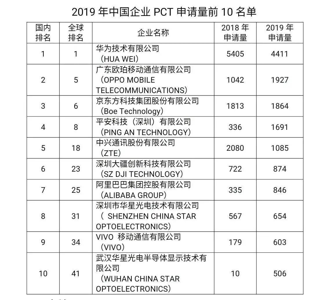 2019年P(guān)CT國際專利申請前十的申請人中,中國的華為技術(shù)有限公司以4411件PCT國際專利申請排名第一。位居其后的是日本三菱電機(jī)株式會社(2661件)、韓國三星電子(2334件)、美國高通公司(2127件)和中國廣東歐珀移動通信有限公司(1927件)。