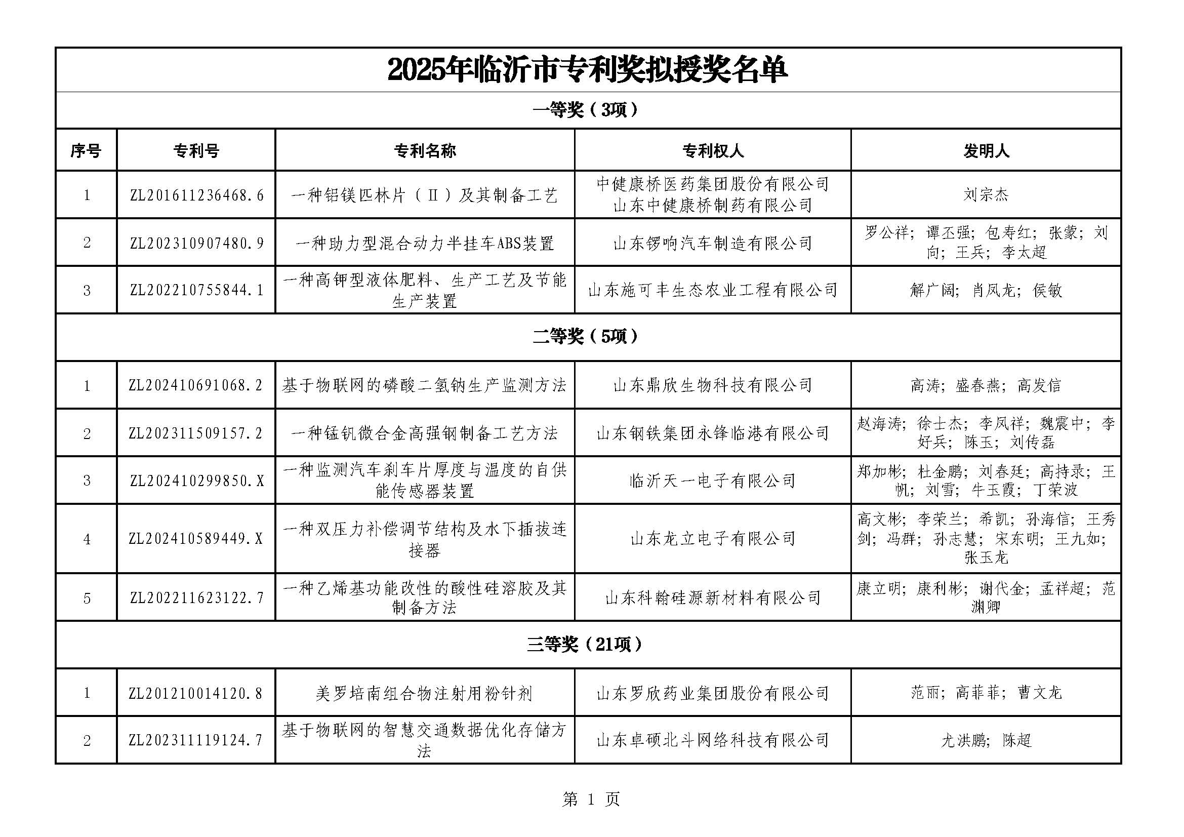 依據(jù)《臨沂市專利獎(jiǎng)勵(lì)辦法》等有關(guān)規(guī)定,現(xiàn)將2025年臨沂市專利獎(jiǎng)擬授獎(jiǎng)名單予以公示,其中一等獎(jiǎng)3項(xiàng),二等獎(jiǎng)5項(xiàng),三等獎(jiǎng)21項(xiàng)。公示期為5個(gè)工作日,自2025年11月11日至2025年11月17日。